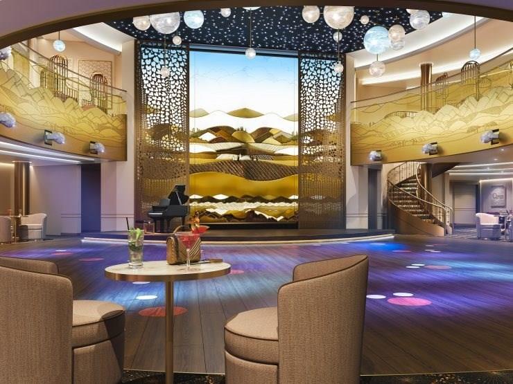 In the elevated opulence of Queen Anne's iconic Commodore Club, be enthralled by dazzling art deco-inspired decor. Sink into a plush seat and soak up breathtaking views from its lofty location on Deck 12, or indulge in an evening drink while the soothing sound of the piano fills your ears.