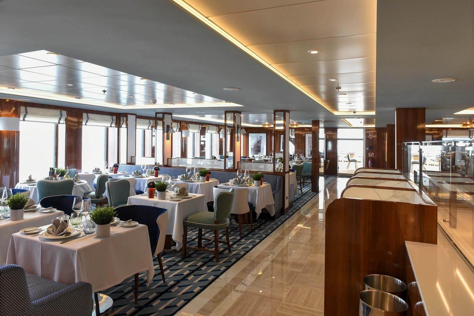 By day, 7AFT Grill serves a casual poolside lunch of tasty burgers, salads, flat breads and other classic favorites. By night, it transforms into an open-air chophouse for a Josper Grill dining experience. Savor the finest cuts of steak and fresh seafood, seared to perfection on a legendary Josper grill, the world leader in charcoal gastronomy. Exclusively on our Epicurean and Cultural Expeditions. Available when weather permits.